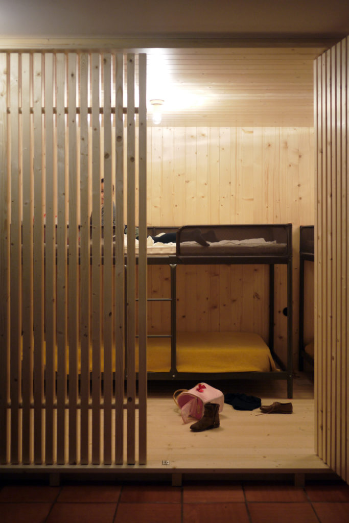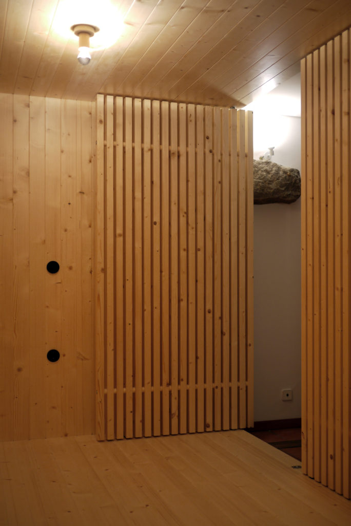 No salão de jogos, uma caixa feita em madeira de Pinho Nórdico (Casquinha) permitiu acrescentar capacidade de dormida à Casa da Serra, em Vila Cova, Barcelos. Foram usadas réguas com o comprimento da largura total do dormitório, só havendo juntas entre réguas no sentido transversal. As portas pivotantes em ripas permitem a ventilação do espaço interior, protegendo simultaneamente.